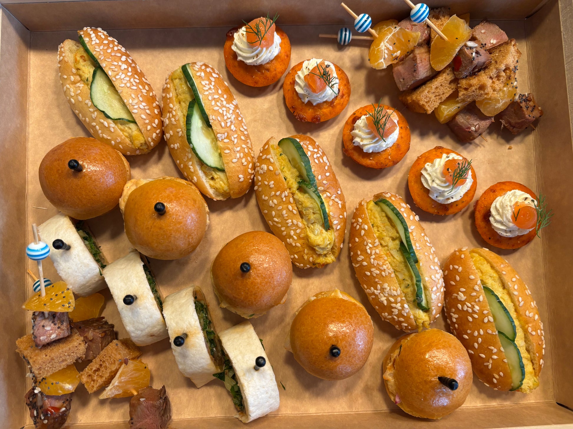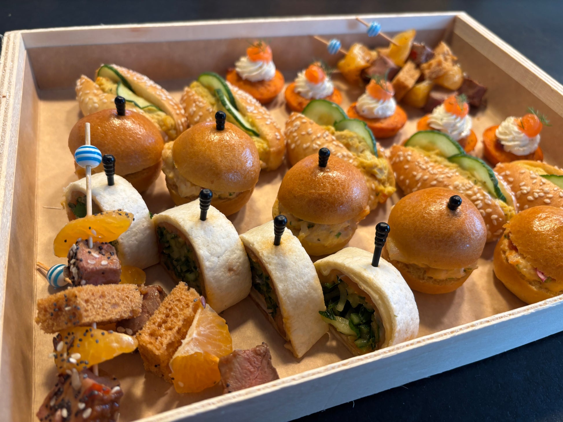 - Pain au sésame, chair de crabe au curry vert & œuf poché de brochet fumé