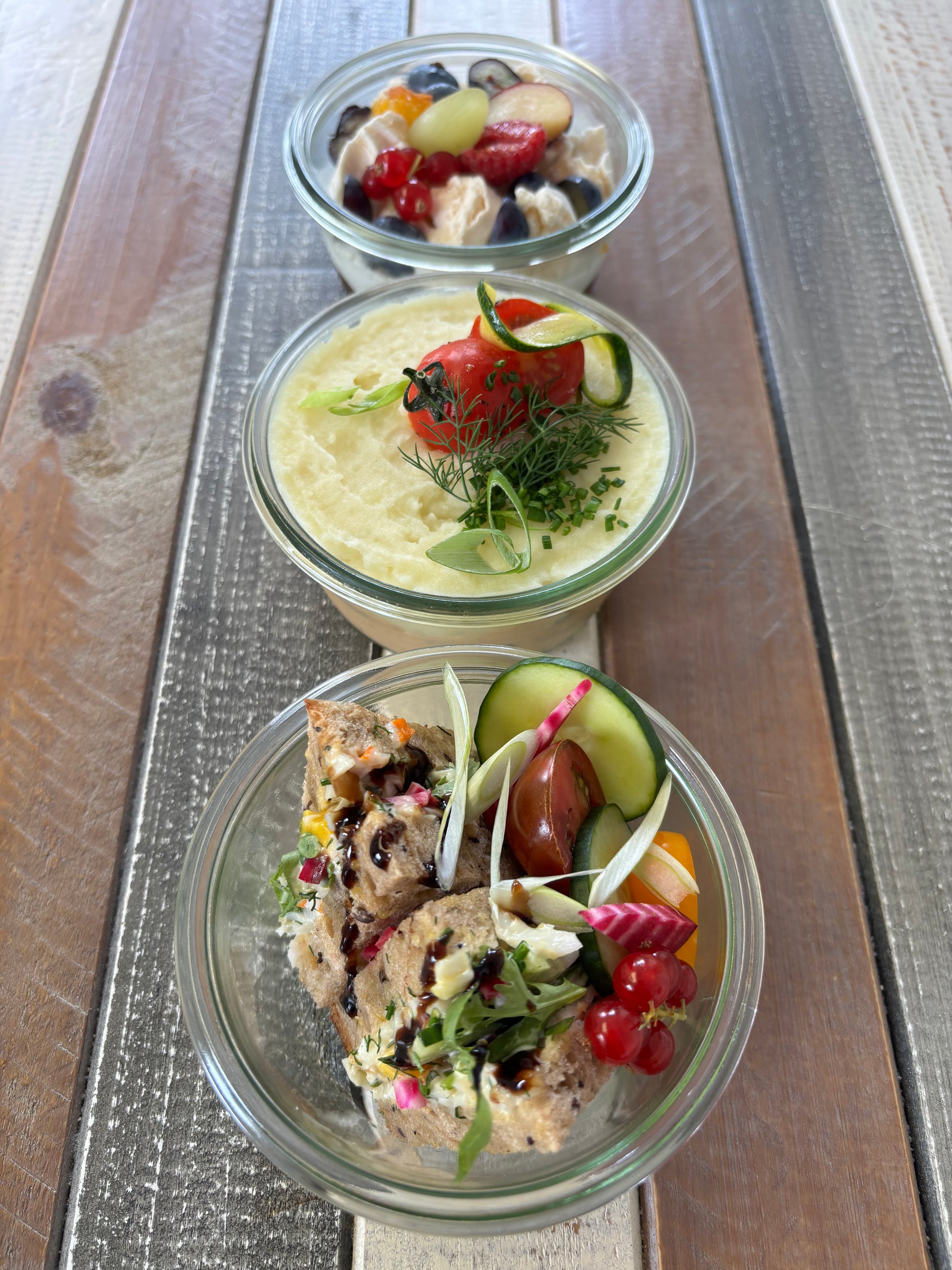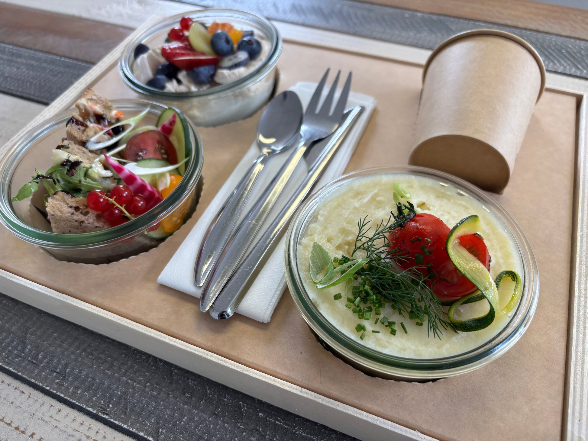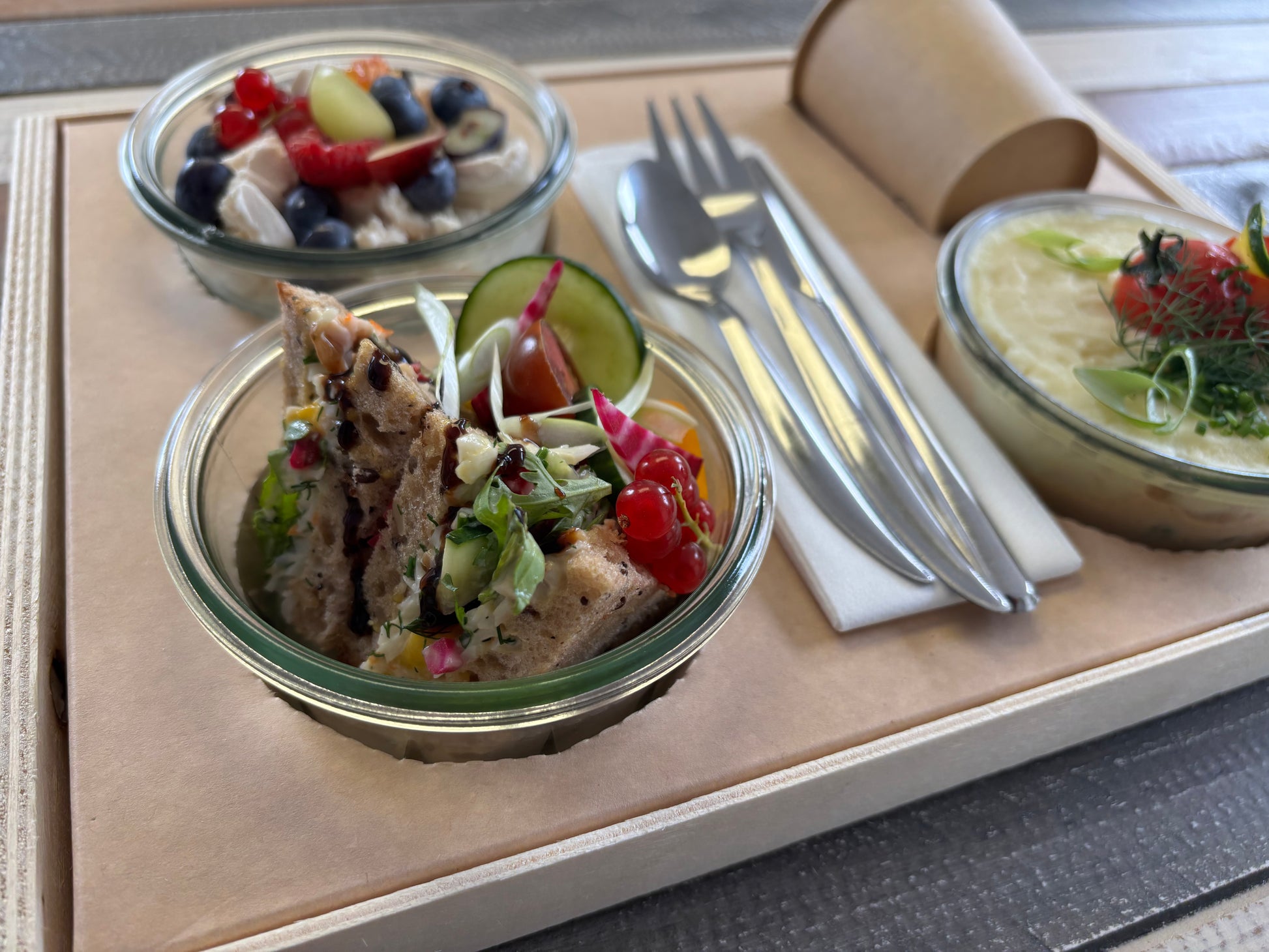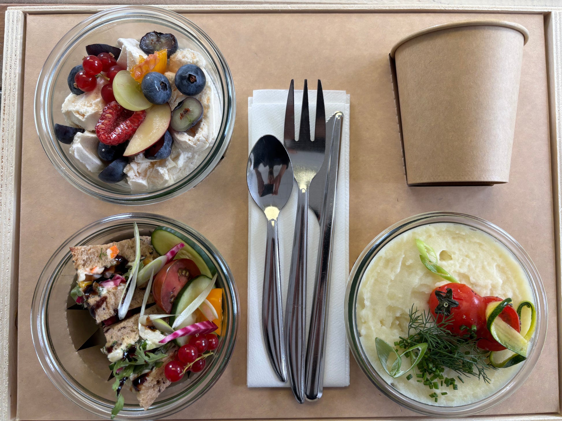 Cagette et couvercle en carton issus de la gestion durable des forêts, fabriqués en Isère, bois 100% alimentaire, recyclable et biodégradable. Verre réutilisable et couverts en inox. Serviettes en papier recyclé. Couvercles plastique 100% recyclable.