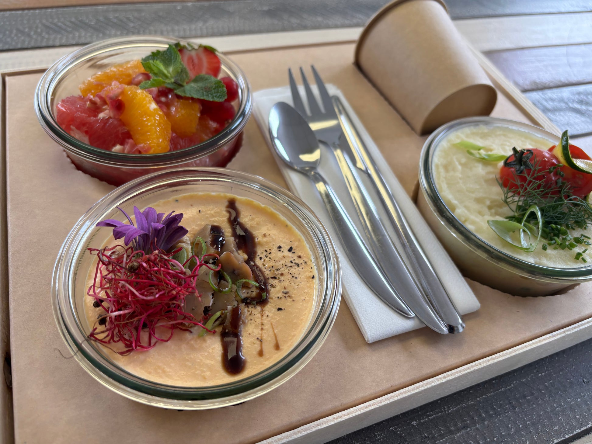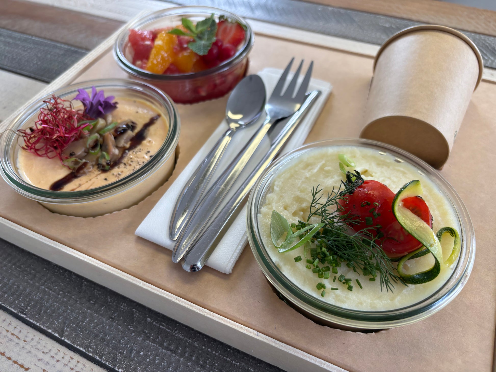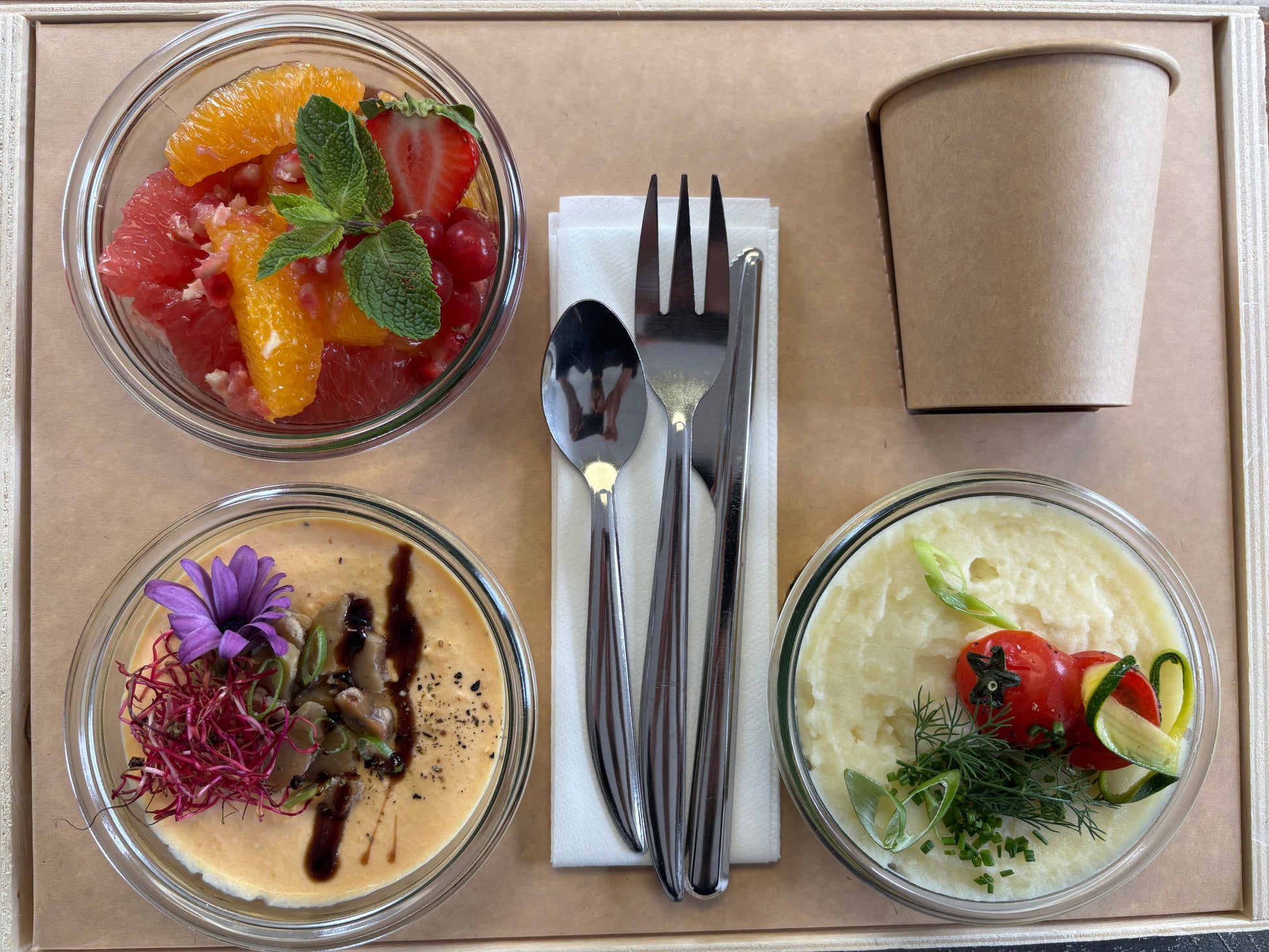 Cagette et couvercle en carton issus de la gestion durable des forêts, fabriqués en Isère, bois 100% alimentaire, recyclable et biodégradable. Verre réutilisable et couverts en inox. Serviettes en papier recyclé. Couvercles plastique 100% recyclable.