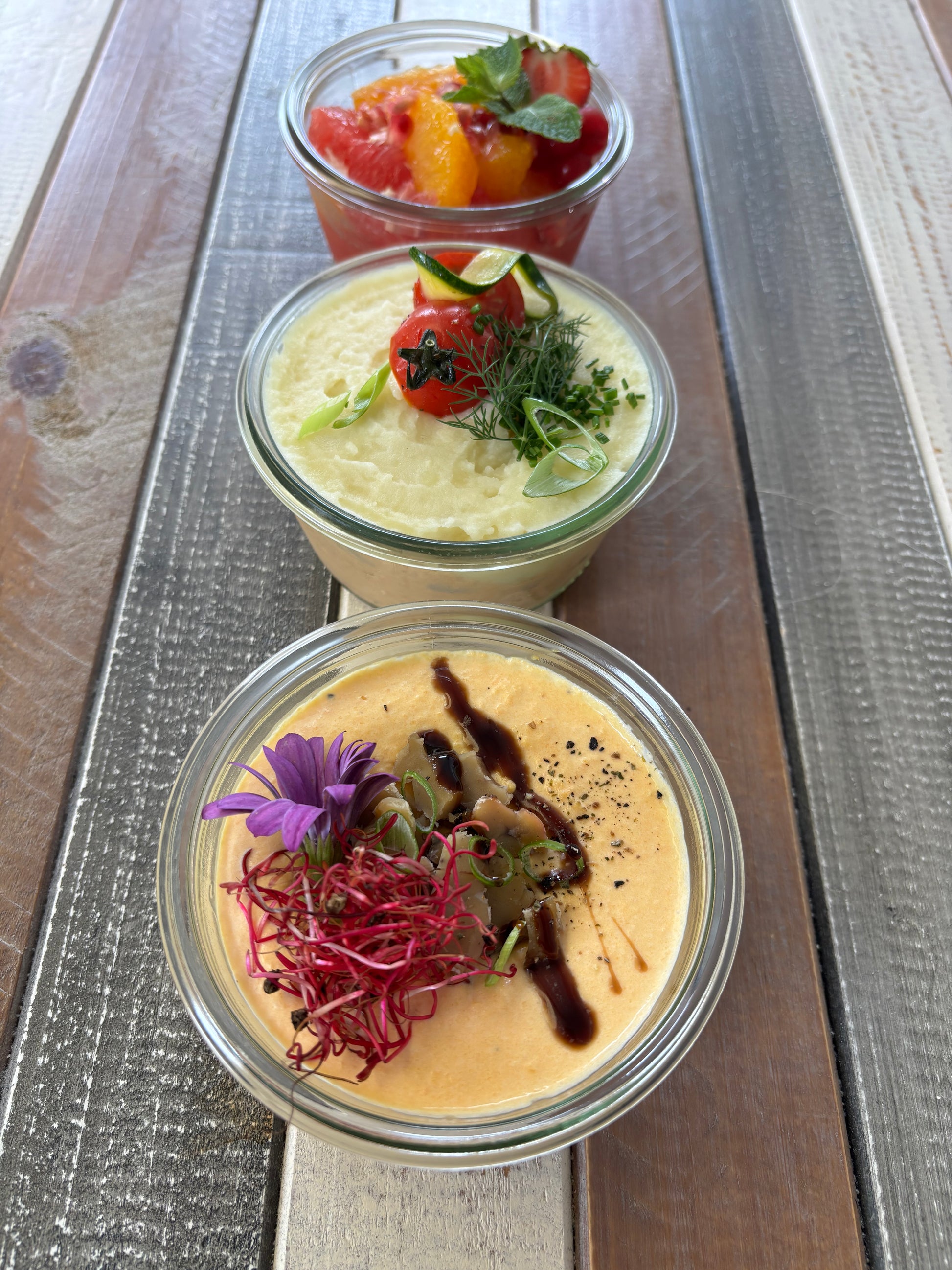 Soupe froide de potimarron, éclats de châtaignes & oignons caramélisées