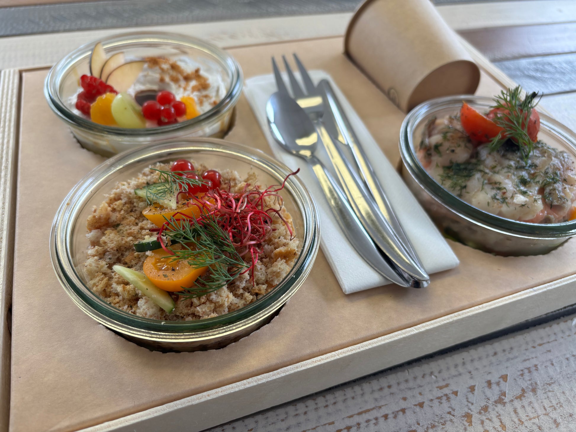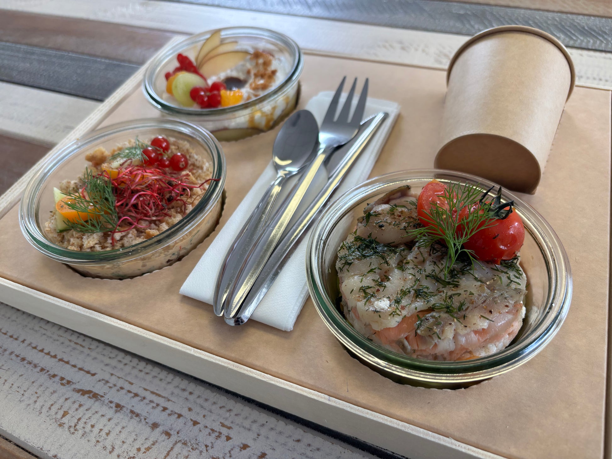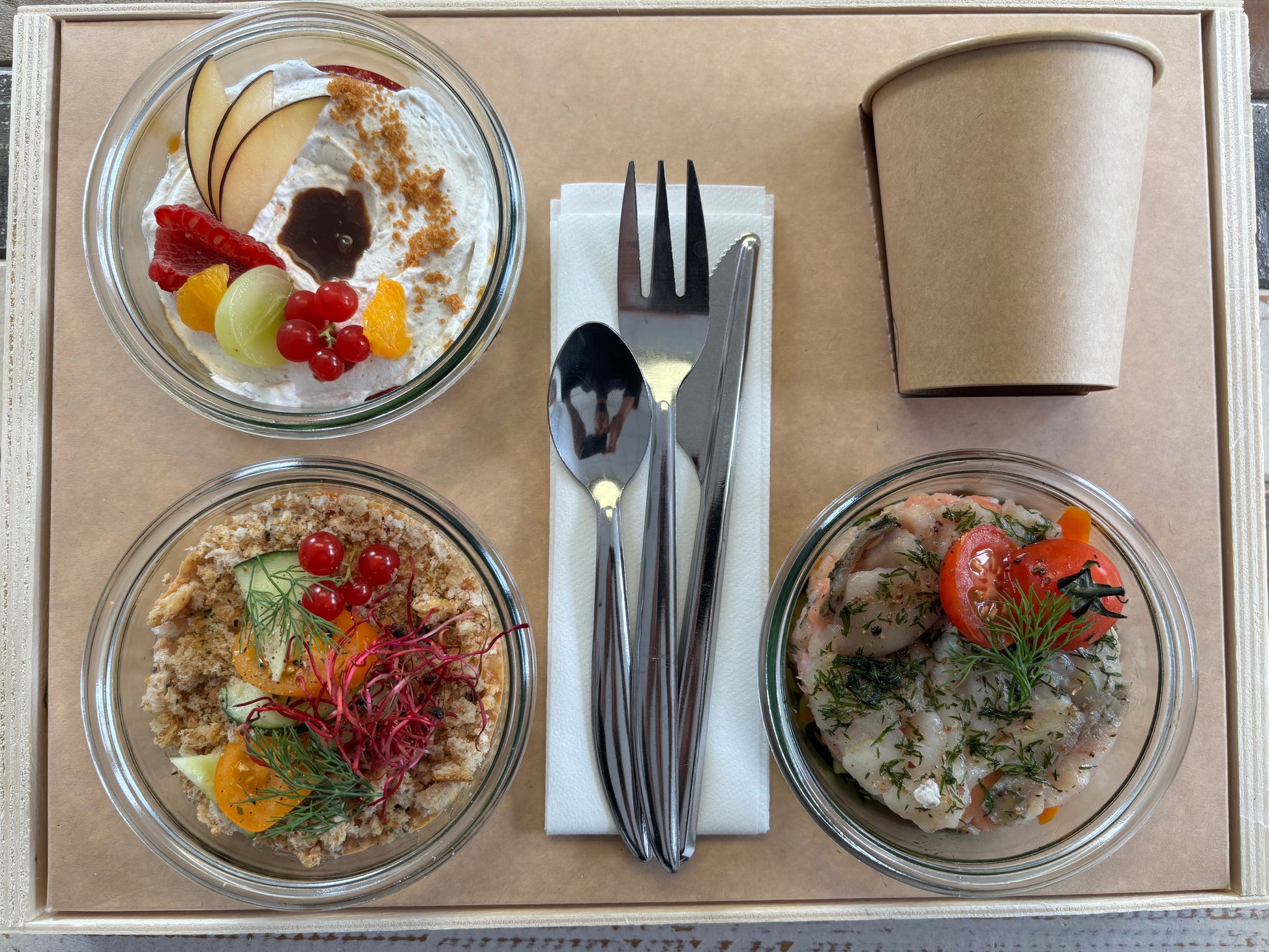 Cagette et couvercle en carton issus de la gestion durable des forêts, fabriqués en Isère, bois 100% alimentaire, recyclable et biodégradable. Verre réutilisable et couverts en inox. Serviettes en papier recyclé. Couvercles plastique 100% recyclable.