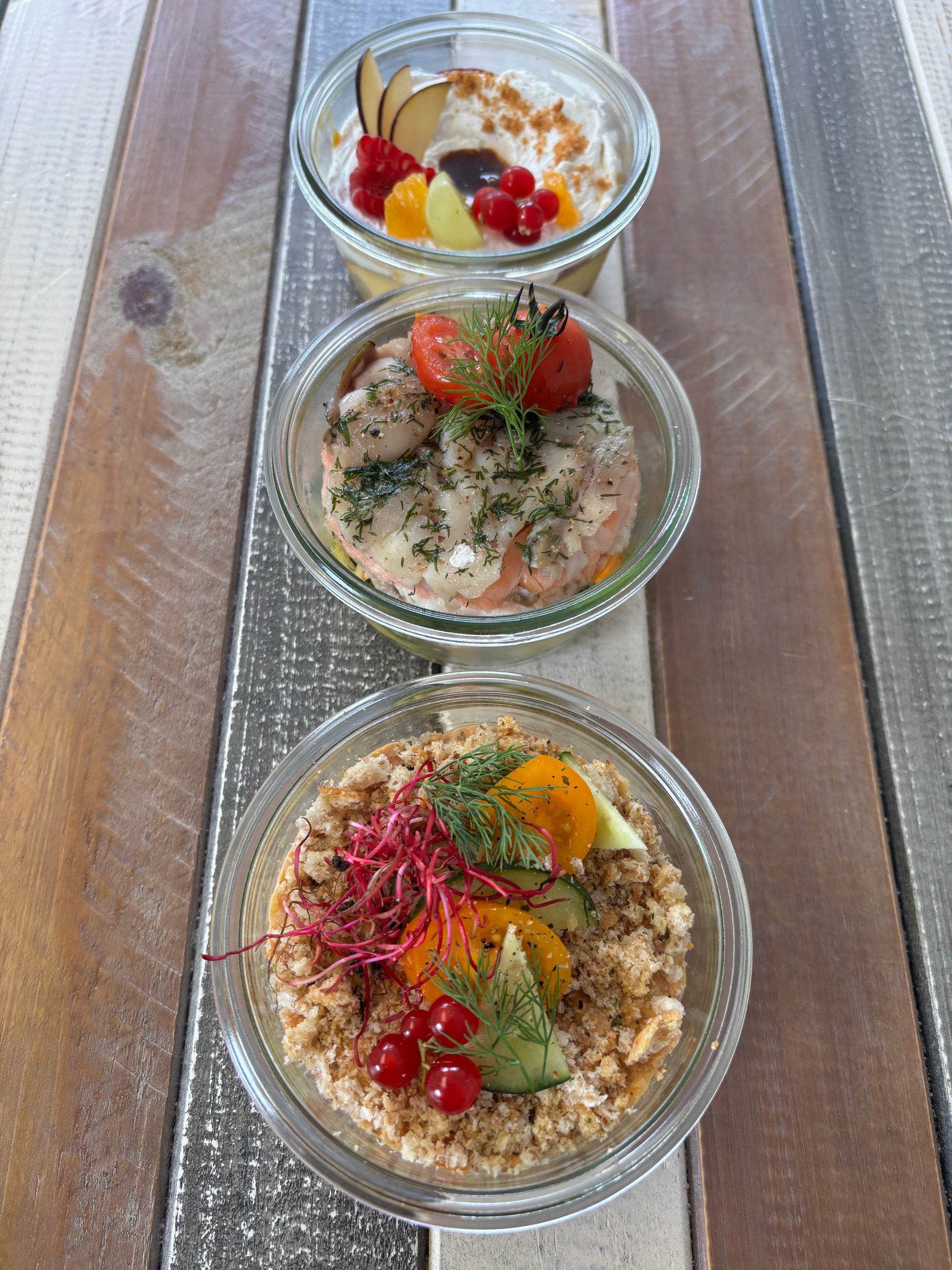 Tiramisu salé au thon, marmelade d'avocats, tomates & concassé de tucs